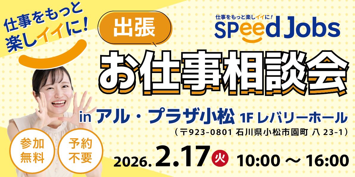 スピードジョブズは、北陸3県のショッピングモールに店舗を構える「店舗型人材エージェントサービス」です。 就職・転職のお仕事紹介や面接同行、現職のお悩み相談など、すべて無料でサポート!専任のキャリアアドバイザーが伴走する〝ひとりじゃない就職・転職〟が選ばれています。